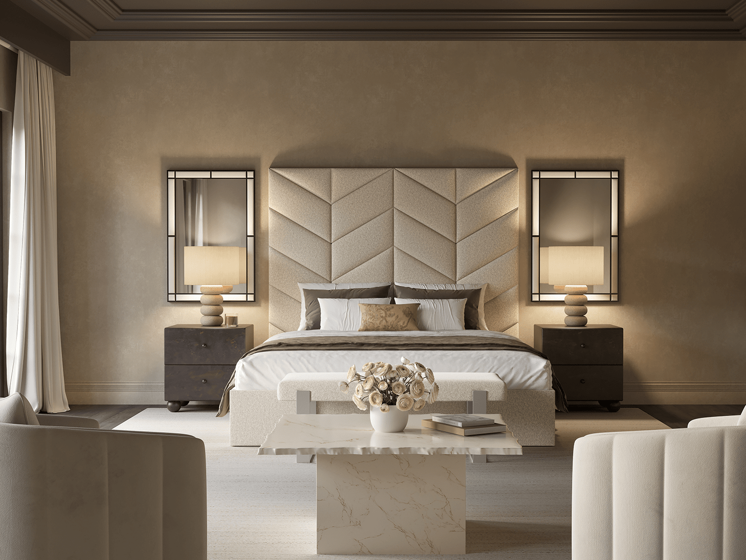 Beneath its sculptural lines lies soft foam cushioning, upholstered in rich, luxurious textiles - combining architectural elegance with tactile comfort.